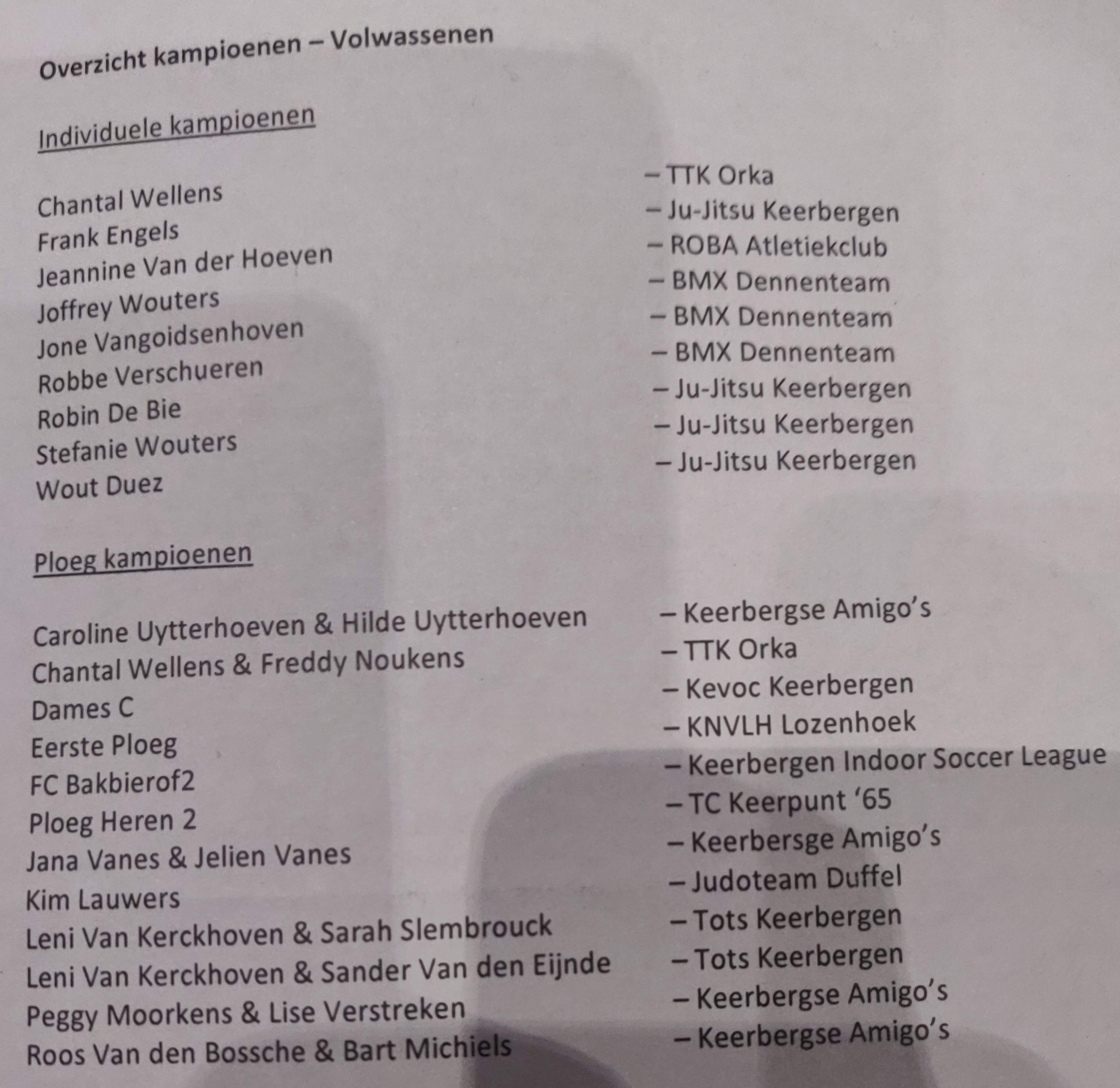 Bij de volwassenen hebben we bijna 50% van de individuele kampioenen afgeleverd. En alsof dat nog niet indrukkend was, is elk van onze trainers een gehuldigd kampioen dit jaar ! Dan weet je dat bij ons goed zit :-)
